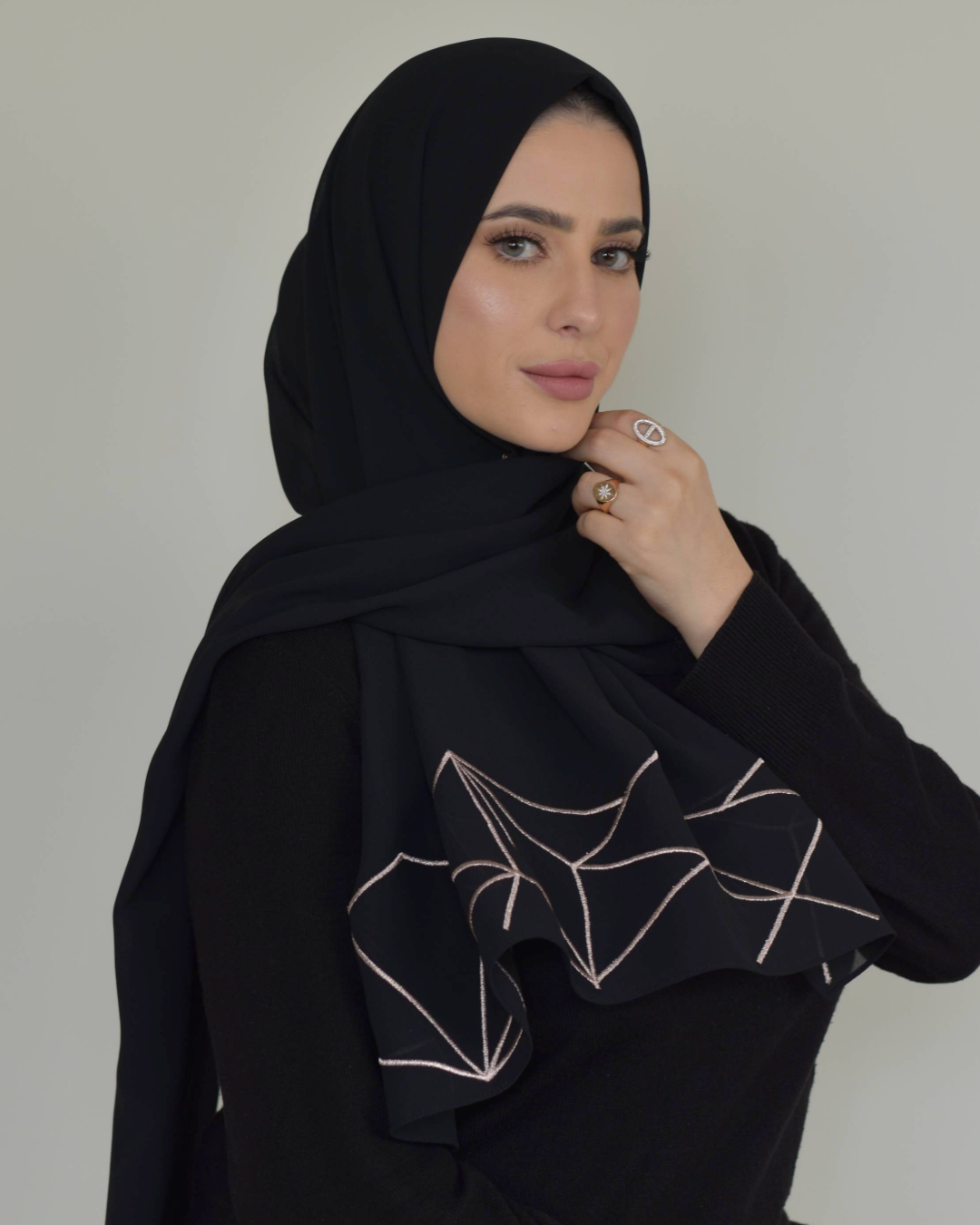 Inspired by the marbled texture, we designed this premium chiffon crepe shawl, with rose gold metallic thread embroidery, on one side for a sophisticated and chic look.